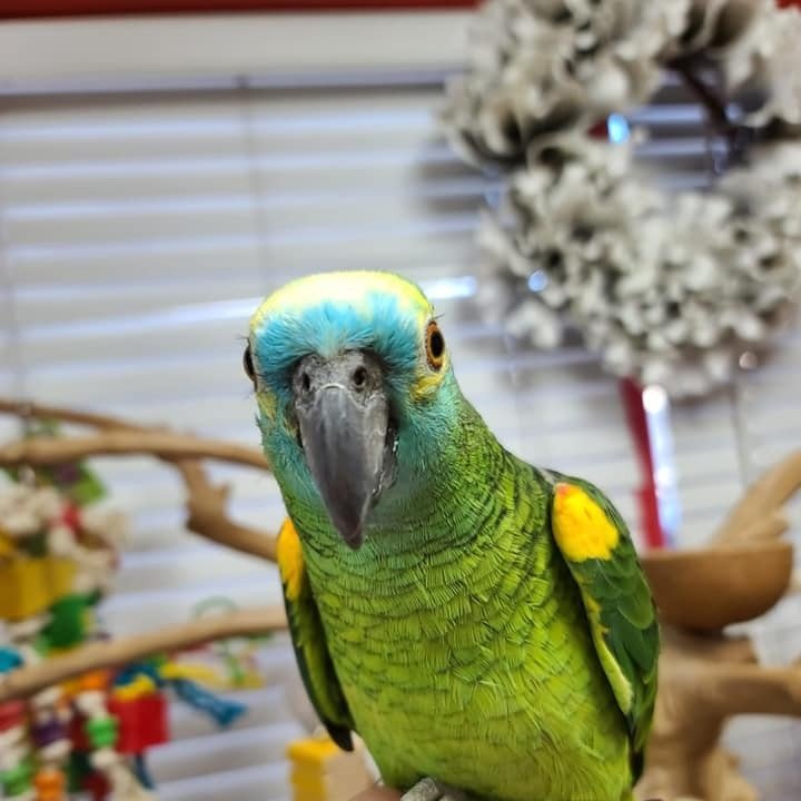 This stunning Blue Front Amazon parrot for sale is now available! It boasts deep, vibrant colors, excellent feathering, and is larger than average for its species. This bird is not suited for beginners, as an Amazon’s temperament requires respect and understanding. It has an impressive vocabulary and loves playing with wooden toys. Fun fact: it has “appropriated” a bell toy from another cage, which quickly became a favorite!