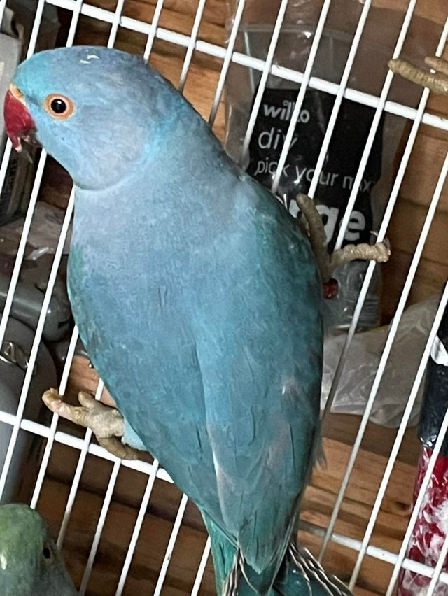 Please note, the green Ringneck in the background has already been sold. This advertisement is only for the Blue Ringneck shown in the picture. The photo is genuine, and the bird you will receive is exactly the one pictured.